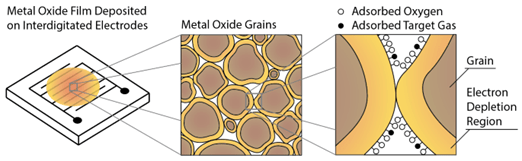 Gas sensors employing metal oxide nanoparticles (grains) in the form of thin films (i.e., the sensing material) rely on changes in the conductivity of the material caused by the adsorption of a number of target gas molecules on their surface, which is proportional to the concentration of the gas in the overlaying gas. The sensitivity of the sensing materials depends on their composition and porosity, which in turn can be tuned by the size of their nanoparticle building blocks. Exploiting the high versatility of the inductive heating generator we have developed, we can produce a range of nanoparticle-based metal oxide materials for highly sensitive and selective gas sensing applications.