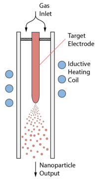 Inductive heating is a highly efficient and contactless method that relies on induced currents to increase the temperature of target metallic materials. By controlling the power that goes into the inductive heating one can increase the temperature of the target materials at levels close to their melting point, and produce metal vapours. Upon fast quenching, these vapour condense to form metallic atomic clusters and nanoparticles which can subsequently be used in advanced materials for different applications. Controlling the heating power and the quenching of the electrode by adjusting the flow rate of the carrier gas, we can produce nanoparticles of different size depending on the material of the target electrode.